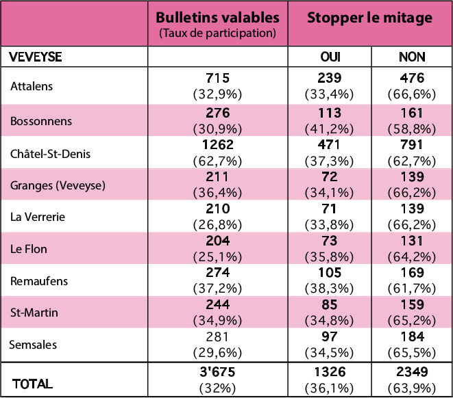 L’initiative contre le mitage a été rejetée, dimanche, par 63,7% des Suisses. Le texte des Jeunes Verts, qui voulait figer les zones à bâtir à leur niveau actuel, n’a trouvé grâce aux yeux d’aucun canton. Fribourg et Vaud l’ont rejeté à 62% et à 62,9%. Les citoyens de la Veveyse ne sont pas demeurés en reste, avec 63,9% de non. Le refus est encore plus marqué dans le district de Lavaux-Oron, avec 65,63% d’avis défavorables. A Essertes, c’est même 71,56% des votants qui ont dit non. En Veveyse, Attalens est la commune où l’initiative a été le plus massivement rejetée (66,6%). Seul objet soumis au vote dans la majorité des cantons, il n’a guère mobilisé les électeurs. A La Verrerie, par exemple, seul 26,8% des votants se sont déplacés dans l’isoloir. Ci-contre, les résultats des communes…